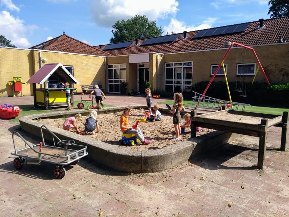grote speelplein en speelveld onder toezicht van een vaste overblijfouder.