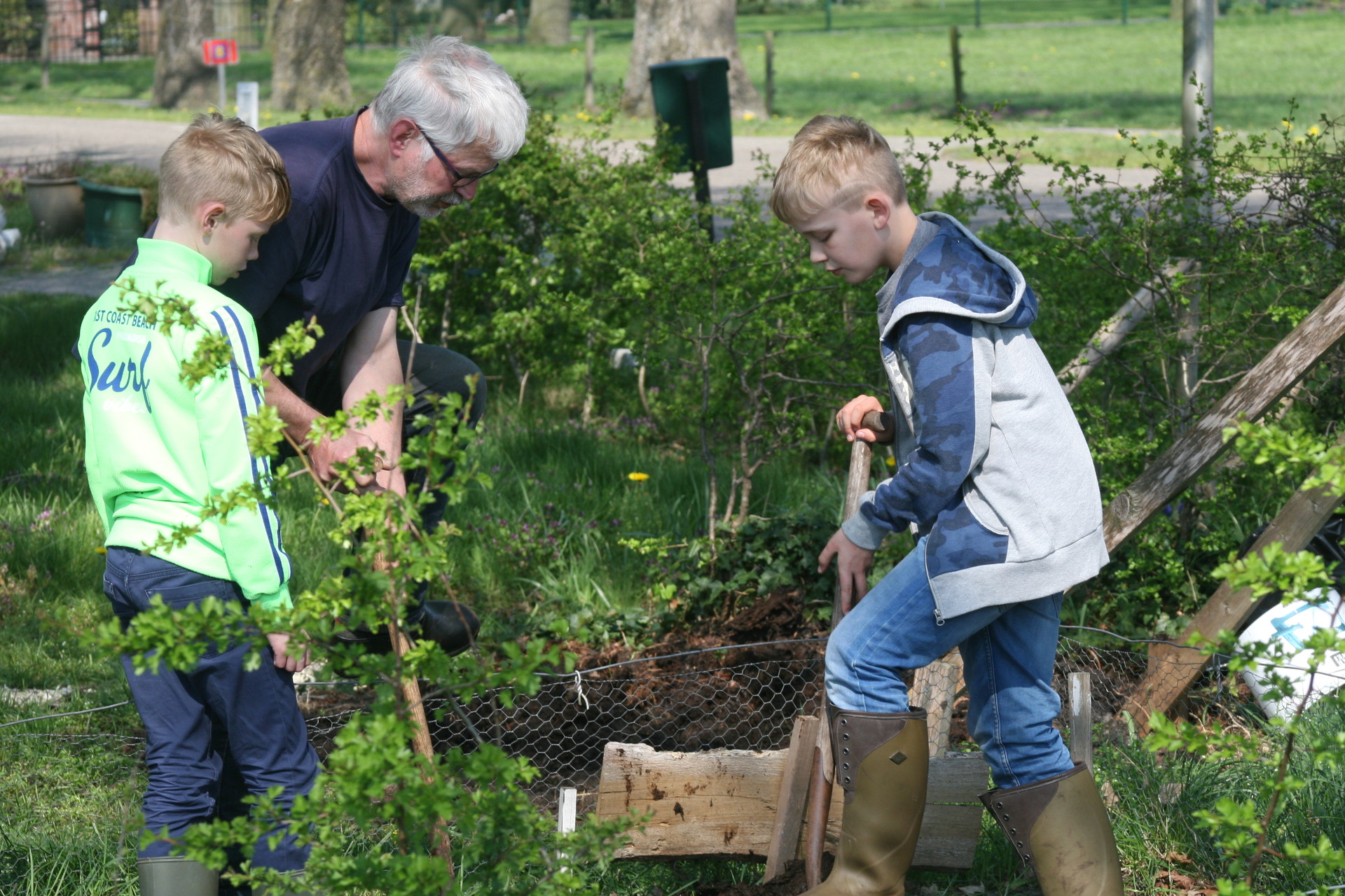 Groep 6-8 werkt o.l.v. een landschapsecoloog in de Triangel Tuintjes.